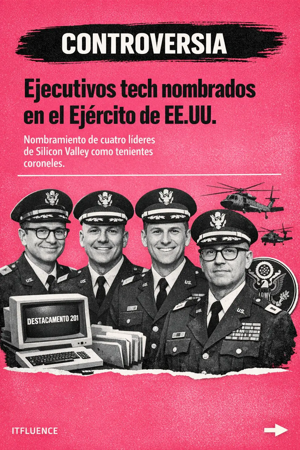 El 13 de junio de 2025, cuatro experimentados líderes del sector tecnológico se unieron a las filas del Ejército de los Estados Unidos en una ceremonia poco convencional. Shyam Sankar, de Palantir; Andrew Bosworth, de Meta; Kevin Weil, de OpenAI; y Bob McGrew, de Thinking Machines Labs, han sido nombrados como tenientes coroneles de la reserva del Ejército. Este evento tuvo lugar en el cuartel Myer-Henderson, un lugar cercanamente situado al Pentágono, como parte del lanzamiento del innovador Destacamento 201.